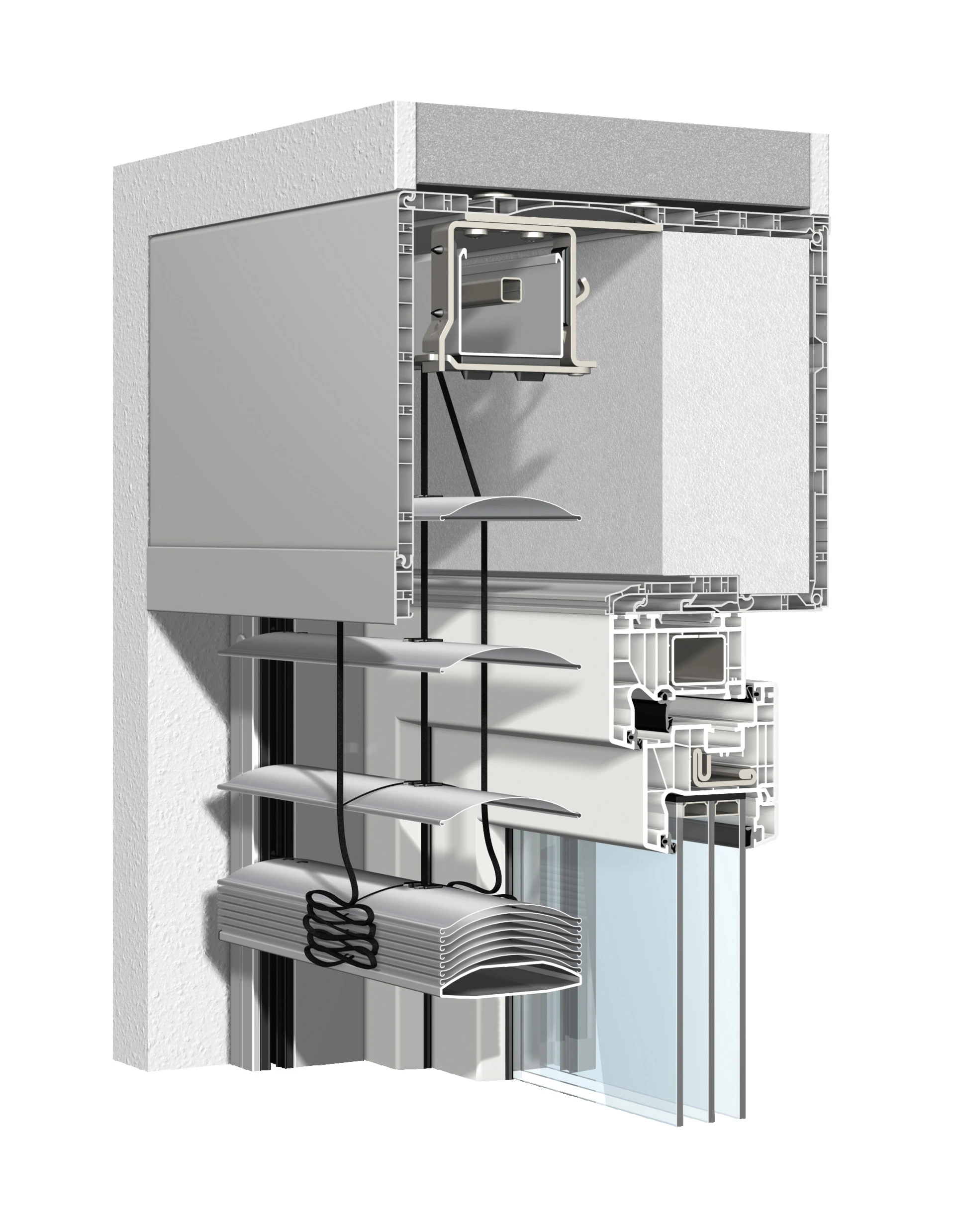 Detailansicht eines modernen Rollladenkastens mit integriertem Fenster